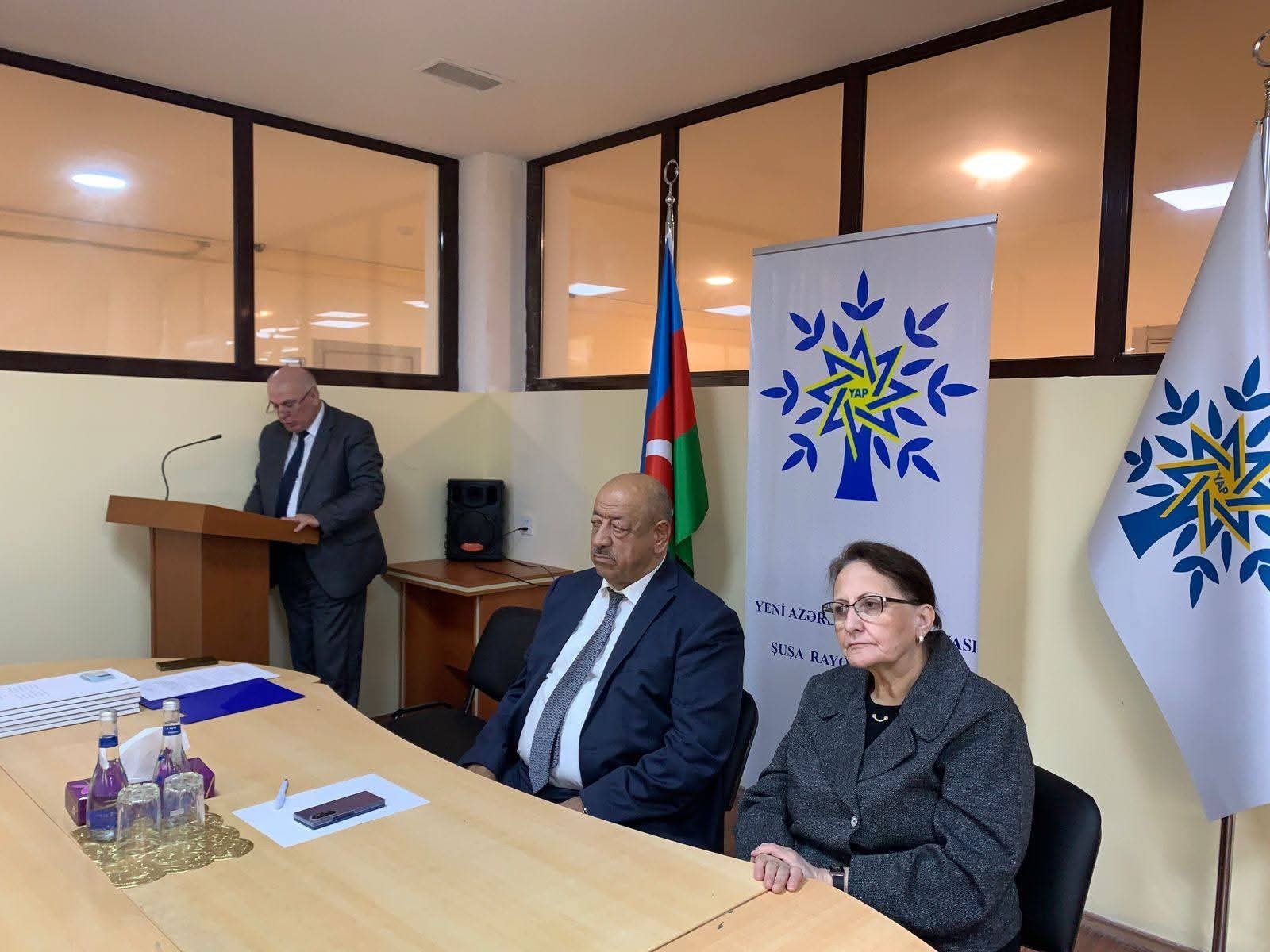 Tədbirdə çıxış edən Şuşa Rayon İcra Hakimiyyətinin başçısı Bayram Səfərov qeyd edib ki, Yeni Azərbaycan Partiyasının yaranması təkcə siyasi hadisə deyil, həm də ölkəmizin taleyində dönüş yaradan mühüm mərhələdir. O bildirib ki, YAP-ın təşəkkül tapması Azərbaycanı xaos və qeyri-sabitlikdən xilas edərək inkişaf və sabitlik yoluna çıxaran əsas amillərdən biri olub. Bayram Səfərov çıxışında həmçinin vurğulayıb ki, Prezident, Silahlı Qüvvələrin Müzəffər Ali Baş Komandanı İlham Əliyevin qətiyyətli rəhbərliyi və rəşadətli Ordumuzun qəhrəmanlığı nəticəsində xalqımız 44 günlük Vətən müharibəsində tarixi Zəfər qazanaraq ərazi bütövlüyümüzü bərpa edib.